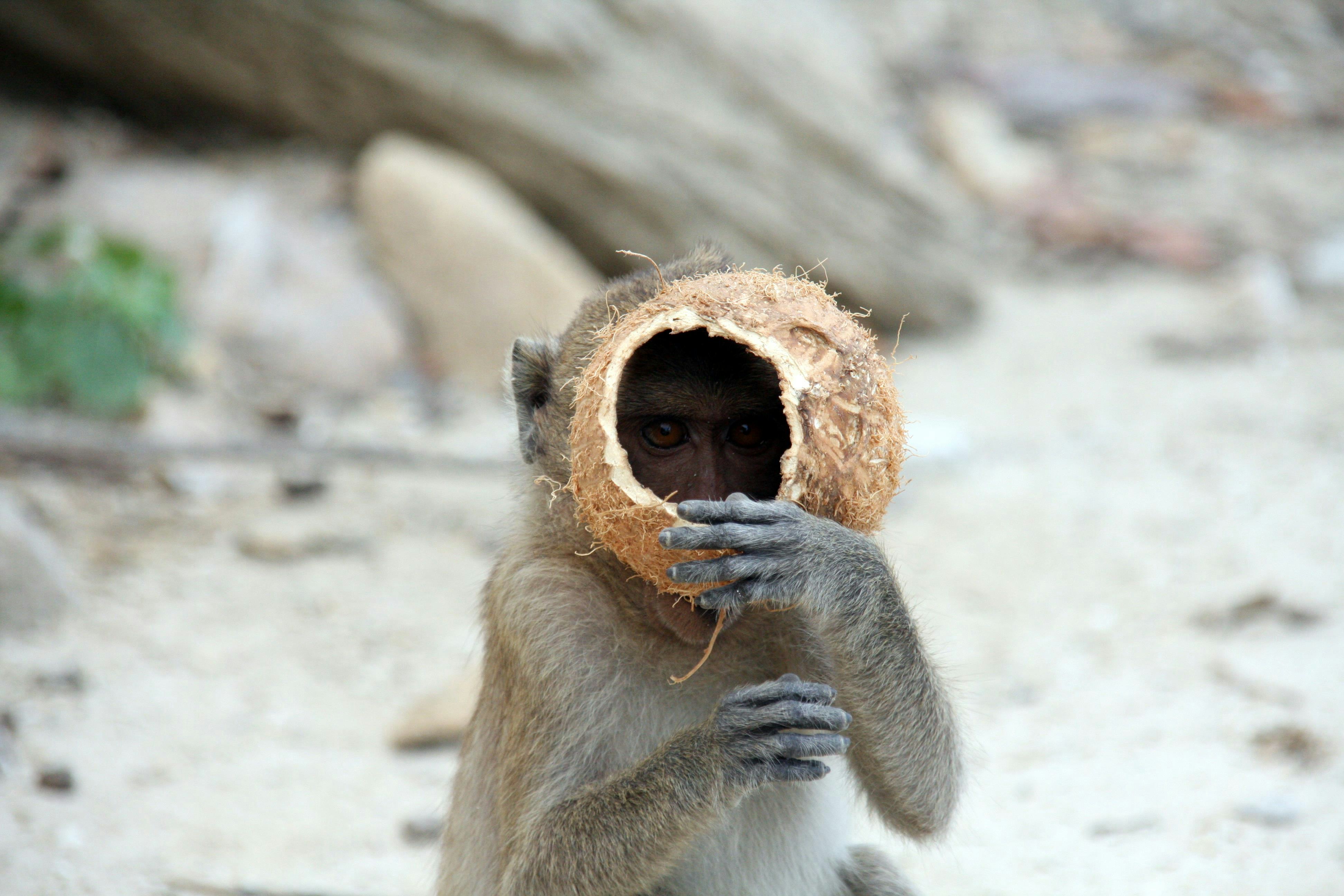 قرود المكاك تكسر جوزات النخيل على سندان حجرية بأحجار المطرقة بيدها.